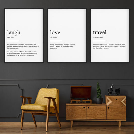 Set of Dictionary Definitions Love Laugh Travel Art