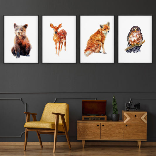 Set of 4 Watercolour Woodland Animal Painting Wall Art