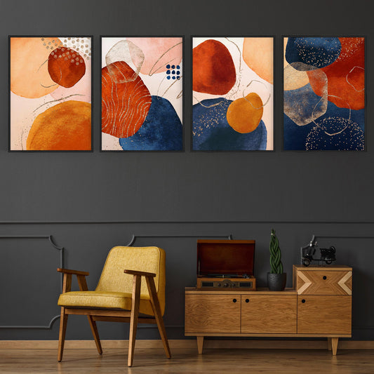 Set of 4 Abstract Blue, Orange and Peach Minimal Wall Art