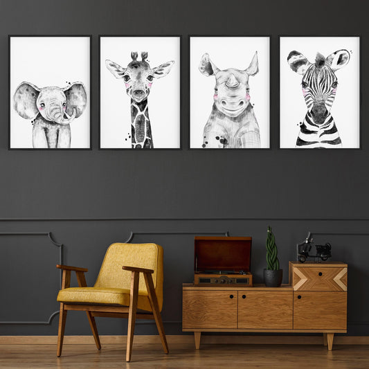 Set of 4 Cute Baby Nursery Safari Animal Drawings Wall Art