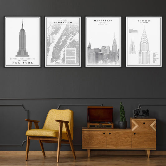 Set of 4 Abstract Grey Minimal Line and Shape Wall Art