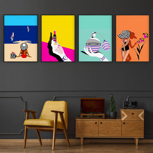 Set of 4 Retro Style Fashion Inspired Colourful Designs Wall Art